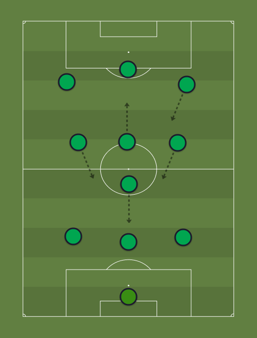 Para el ataque, formo con un dinámico 3-1-3-2-1. Da flexibilidad a los movimientos de balón, sobre todo buscando el pase que supere líneas de la defensa contraria, sea con la fluidez del pase raso y corto, creando espacios entre los tres mediocampistas de ataque para crear situaciones a los delanteros, sea con el pase directo a los rápidos extremos (Neymar, Mbappé) que también tienen funciones de segundos delanteros. El trabajo de Kane entre los centrales, más los desmarques y pivoteos a los espacios laterales, es la referencia principal del gol. En defensa, la línea de 3 se transforma en una de 4, con Kanté (de líbero) haciendo las ayudas en los espacios abiertos cuando el rival esté a pocos metros del área. De Bruyne (más cerca de Coutinho) y Modric (éste con más intensidad defensiva) bajan a cubrir al francés en el centro del campo, con Coutinho listo para crear al momento del contragolpe con los recursos en velocidad junto a los delanteros. Mbappé sólo tendría que bajar unos pocos metros para enlazar con los mediocampistas para lograr un dibujo táctico sobre la pista como un fluctuante, zigzagueado, 4-4-2. La presión alta es clave en el momento en que los defensas y los volantes manejan el balón en el primer cuarto de cancha. Los errores contrarios deben ser objetivados en situaciones de ataque. En ese sentido, la dinámica de la defensa a la ofensiva es flexible, por ello la afluencia de mediocampistas que puedan crear espacios con un simple toque de balón, un desmarque o un pase entre líneas. La seguridad de los tres zagueros debe ir acompañada de un adelantamiento de la última línea con la tenencia del balón.