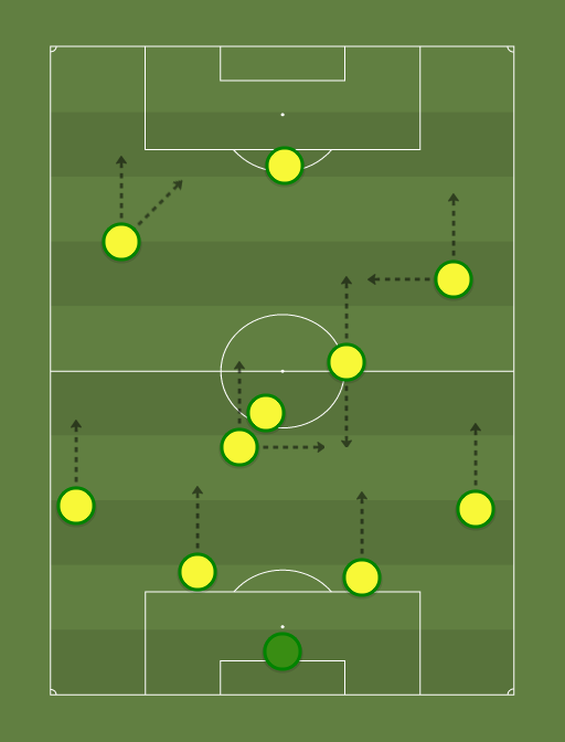 Starting from the front, Jesus makes himself a target man and an option for 1 2's for incoming runners while pulling the opposition center backs towards him to make space for Neymar and Coutinho. Neymar is the winger that cuts in to find the space to score while Coutinho either goes to the middle to dictate play or go out wide to deliver crosses. Paulinho does the job of two people, in possession he becomes a central option in the attack as a late runner while out of possession he breaks down counters before they reach the wall of Casemiro. Augusto becomes the metronome in the back as he connects the play and covers the space behind Marcelo. Casemiro is the protection for the back line as all attacks that pass Paulinho are cut out by Casemiro, he also acts as reset when in possession. Marcelo and Alves act as almost wingbacks due to them having to provide the width with Neymar and Coutinho cutting in. Miranda and Marquinos complete the back line and acts as the sweepers and classic defenders as most attacks are to be broken down before reaching them. Alisson acts as a normal keeper, staying close to his line and does not act as the sweeper but Ederson might be a choice as a sweeper keeper.