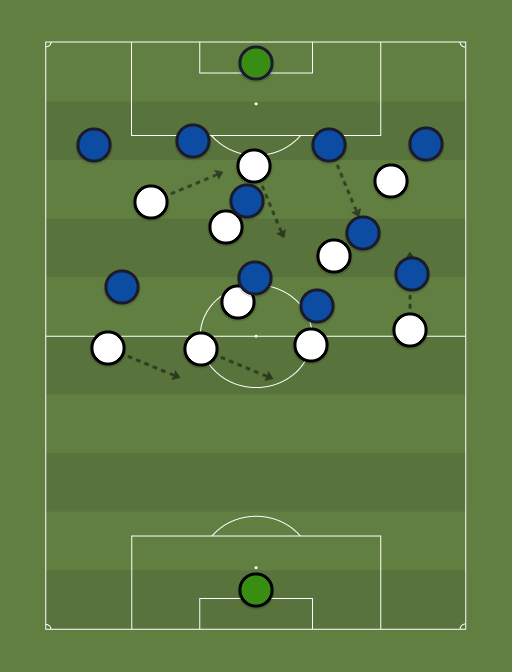 Left center back of Blues receives short pass from GK He plays the ball quickly forward to Left center mid Center Forward of white now has to drop to AREA of the ball to OVERLOAD LEFT WINGER of white now has no use staying on left and must take place of CENTER FORWARD in case opponent makes pass back Left back and left center back of white are ready to cover as chance of long ball on right side is high Do not allow opponent to switch point of attack SO for good pressing and winning the ball: 1) man marking of short passing options in front of player who has ball 2) 1 free player goes to area of the ball to provide coverage and better pressing, WINGER who is on opposite side of the pressing 3) close down player who has ball and PREVENT him from switching sides, FORCE him to keep the ball on the side of the pressing