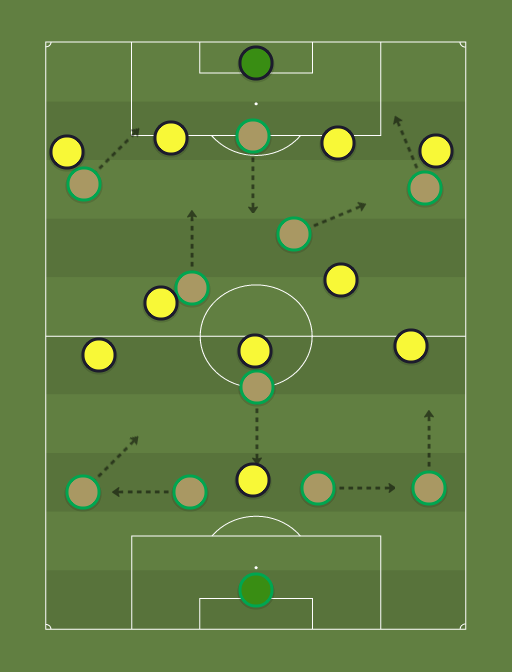 The combination of Bielsas and Guadiolas philosophies is not done very often but I believe will be very effective. Implementing Bielsas high press with Guadilolas possession dominant game results in a very effective system. Each player has a role and each role is important in the system working. The Lb comes infield when in possession and out of it holds at left back. His/her role is known as an inverted wingback. Unlike the lb ,the rb is a traditional full back attacking up and down their wing. To allow this to be effective the two cbs drop out wide allowing the the cdm or 6 to dro in between creating a back 3 with the inverted wingback to be in front as a deep lying playmaker. the two cm in front have an important role as one picks up space and the other roams and mainly goes towards the wing and the striker acts as a false 9 and drops into the attacking midfield position creating space for the right and left wingers to make inward runs Out of possession the team holds its traditional 4-3-3 shape and press high and at an extreme intensity this demands high fitness levels for each player as each player must press when out of possession. i have lined out an opposition in todays most common formation which is 4-2-3-1 and this shows the spaces and positions my team pick up when in possession and attacking. my team has a 7 second rule when they lose the ball they must win the ball back or regain their defensive shape of 4-3-3 in 7 seconds! . this is all about quick transitions and play must be fast quick and accurate.