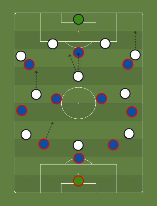 Possession-based style of play. Solid, high pressing with a back-3 that'd help retain possession and keep the danger of counter-attack plays by opposition teams at bay. Attack-minded, quick wingbacks at WB positions to support the wingers in stretching out the opposition defense, which would give room for the double pivots to play line breaking passes into the opposition box to a crucial marksman, tailormade to finish off the chances created. Cons are also prevail with this system: Will struggle against lowblocks(4-4-2) Teams that are deadly at counter attacking football can cause a lot of problems for the defense and that'd require highly skilled players like David Alaba (Bayern Munich) and Virgil Van Dijk (Liverpool) to excel in this type of system. So, teams intending to use this type of system will definitely have a high line of defense throughout the game. Players will have to train hard to achieve excellent amounts of stamina to perform at their best level throughout the 90 minutes.