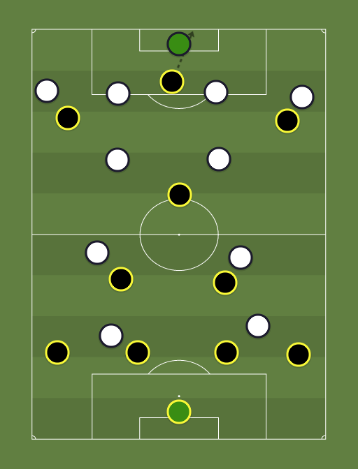 -Linha defensiva com 4 jogadores, sendo que os laterais irão focar na parte defensiva, para dar mais liberdade ao setor ofensivo. Necessário concentração e virilidade. -2 volantes centralizadas com ótimo passe como característica, buscando os pontas e intercalando na subida para dar opção de entrada de área, para alguma oportunidade de chute fora da área. Necessário um raciocínio lógico e estar atento pois são cruciais para a armação do contra golpe. - 1 meia armador solto pelo meio de campo( como o Luan na época do Grêmio) com total liberdade, ficando entre o espaço da linha da defesa e do meio campo adversário. Em momento será um falso 9, entrando dentro da área para dar opção para o cruzamento e para confundir o adversário, enquanto o volante sobe para chutar de fora da área. Necessário ser criativo. -2 atacantes abertos pelos lados do campo, velocistas para o contra-ataque que é a característica principal do time. Necessário ter ao menos um habilidoso, ousado, que vai para cima da defesa, para fugir do comum. - 1 Atacante centralizado como referência para a finalização, sendo pela bola na área, ou um passe em profundidade para sair na cara no gol, e também o pivô que dependendo da ocasião será um ponto de fuga. Necessário ser forte e resistente para combater com os 2 zagueiros, saber o básico do pivô para uma jogada surpresa e um exímio finalizador.