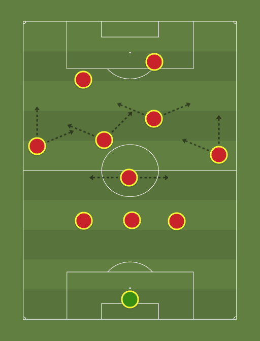 POSICIONAMENTO OFENSIVO - Zagueiros e Volante 1: Trinca permanece adiantando ao máximo os jogadores adversários. - Volante 2: Um pouco recuado para interceptar possíveis contra-ataques. - Volante 3: Bom próximo ao armador para auxiliar na construção da jogada. Chutes fora da área, viradas de jogo e elemento surpresa na área. - Armador: No meio armando as jogadas e dando a opção de passe. - Laterais: Abertos ou infiltrados no meio, dependendo do contexto do jogo. - Atacante: Movimentação para dar opção de passe e abertura para os laterais e aproveitando os passes em profundidade. - Centroavante: Fixo na área. A grande área necessita dele. Está ali para finalizar, 1 chute, 1 gol. Realização do pivô para quem vem de trás finalizar e tabelas com o Atacante para clarear chances de gol.
