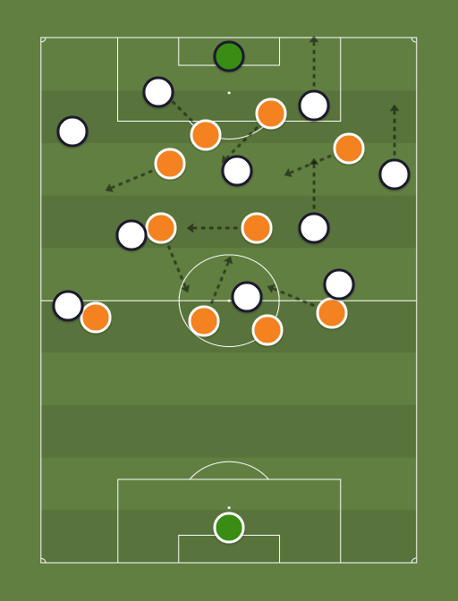 BBT: Rechter aanvaller zet Linkerverdediger vast, Spits druk op Linker centrale verdediger. Linker aanvaller laat de Rechter verdediger beetje vrij. Zodra keeper Rechter centrale verdediger inspeelt. Gaat de Linkermiddenvelder druk zetten op de bal/RCV. Deze zal de RV in spelen iedereen kantelt naar de bal en er wordt agressief afgejaagd.