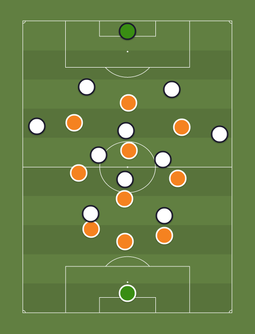 BBT: Rechter aanvaller zet Linkerverdediger vast, Spits druk op Linker centrale verdediger. Linker aanvaller laat de Rechter verdediger beetje vrij. Zodra keeper Rechter centrale verdediger inspeelt. Gaat de Linkermiddenvelder druk zetten op de bal/RCV. Deze zal de RV in spelen iedereen kantelt naar de bal en er wordt agressief afgejaagd.