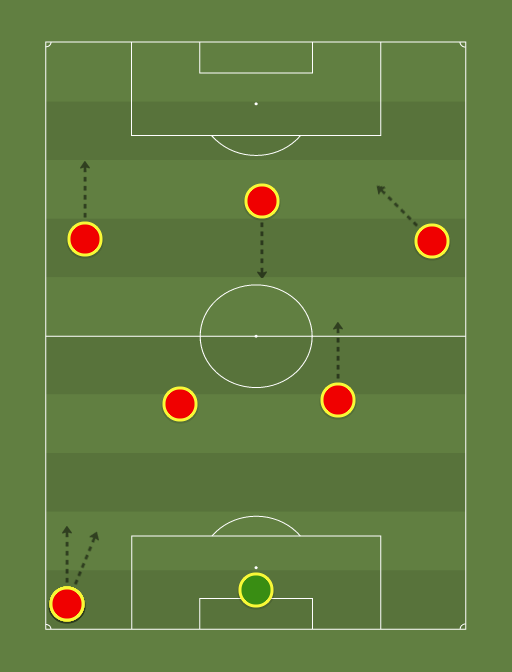 With Alex still injured, she should play up front, but as a false nine- coming back to collect the ball in the middle and then distribute to the wings (either toward the corner flag or the post - see the illustration for what I mean. This way we're still able to utilize her skills, but we're not asking her to cover on breaks or make forward runs that her leg won't let her make. Additionally, we can send one of our central defenders forward, to run off of Alex's shoulder and into the channels, playing one-twos. Defending against the first team, we need to be aware of backside runs- if I remember correctly, they had one or two back-post tap-ins, and two one-v-one breaks (and a ridiculous cross/shot that I really should have kept out). So commit forward when we can, but be ready to get back at speed.