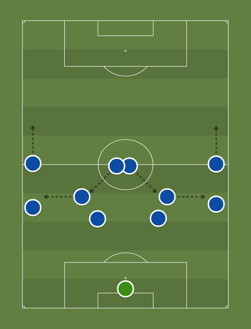 The ball is passed back to one of the midfielders, who immediately passes it to the fullback. After the kickoff, the wingers need to push into the other team's half quickly. The CF will follow, but more slowly. When we have a chance, the midfielders should regain their shape.